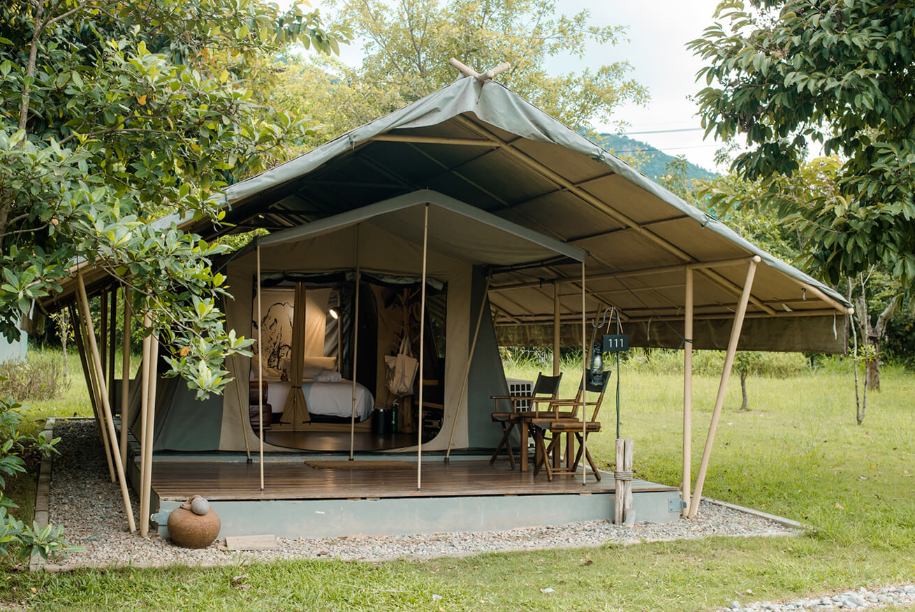 Alone standing air-con standard tents, eco friendly with shared shower and toilet for affordable camping experience, best suitable for younger couples and friends, families with up to 2 young children (1 sharing parent’s bed, 1 sleeps on sofa bed at surcharge)